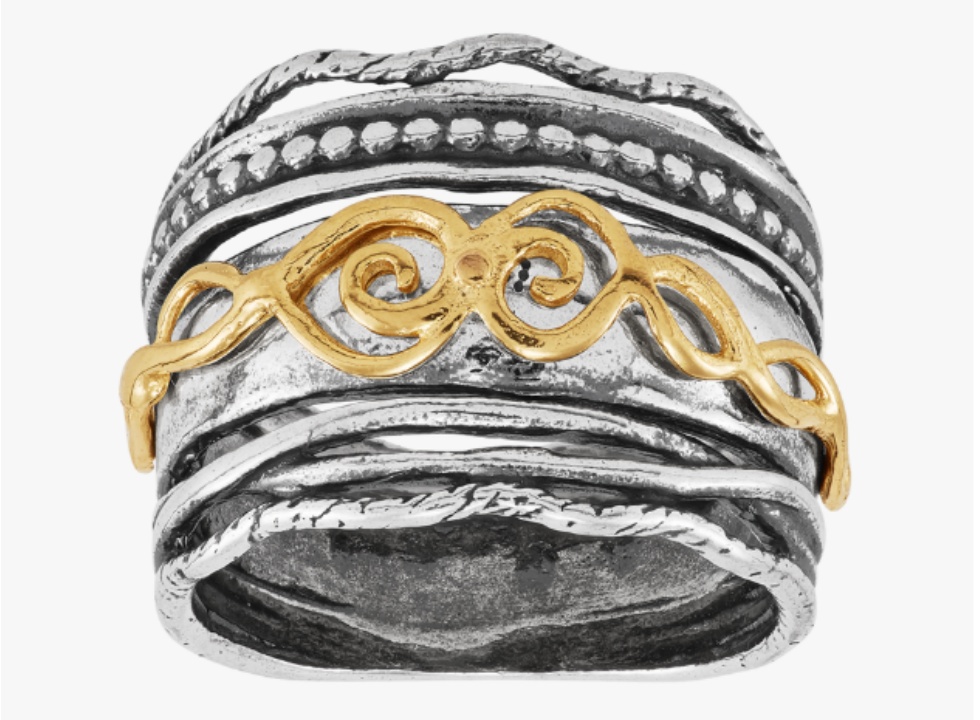 A modern take on a mythological namesake, the Aphrodite Ring features a stunning two-tone design that mixes sterling silver with a warm gold-finished accent. The open, sculptural band and delicate cable details give it an airy, feminine complexity that looks far more expensive than its price tag.